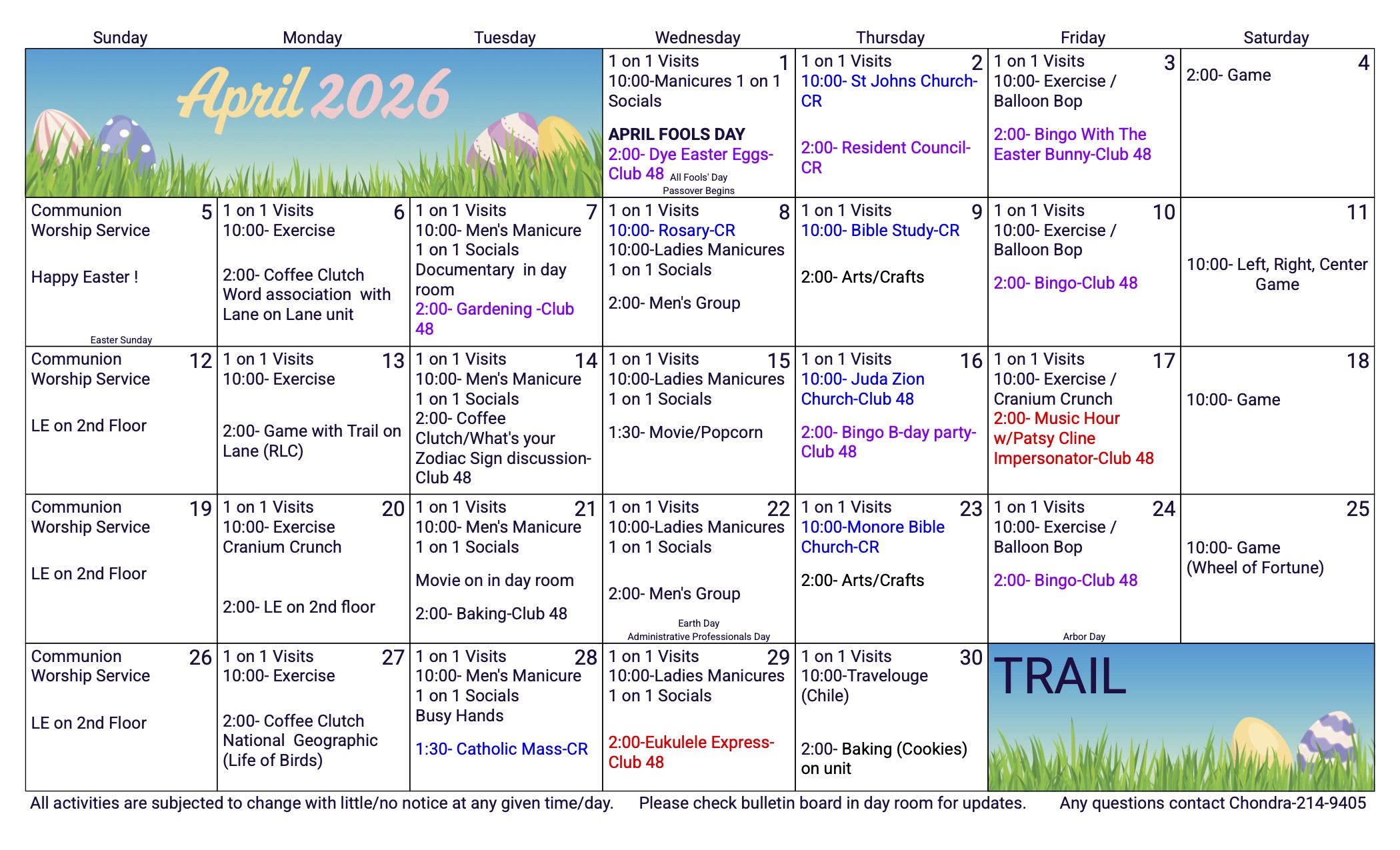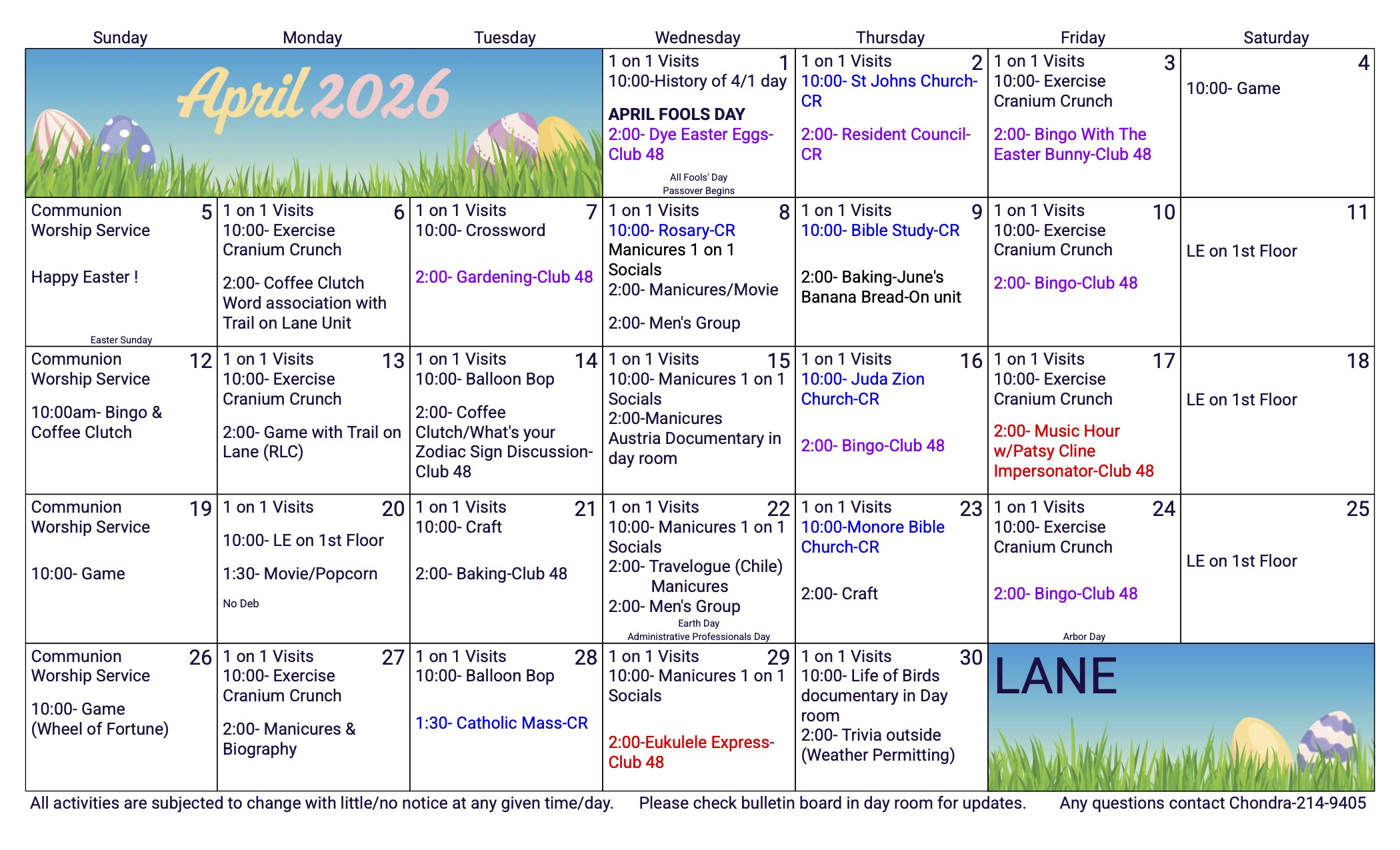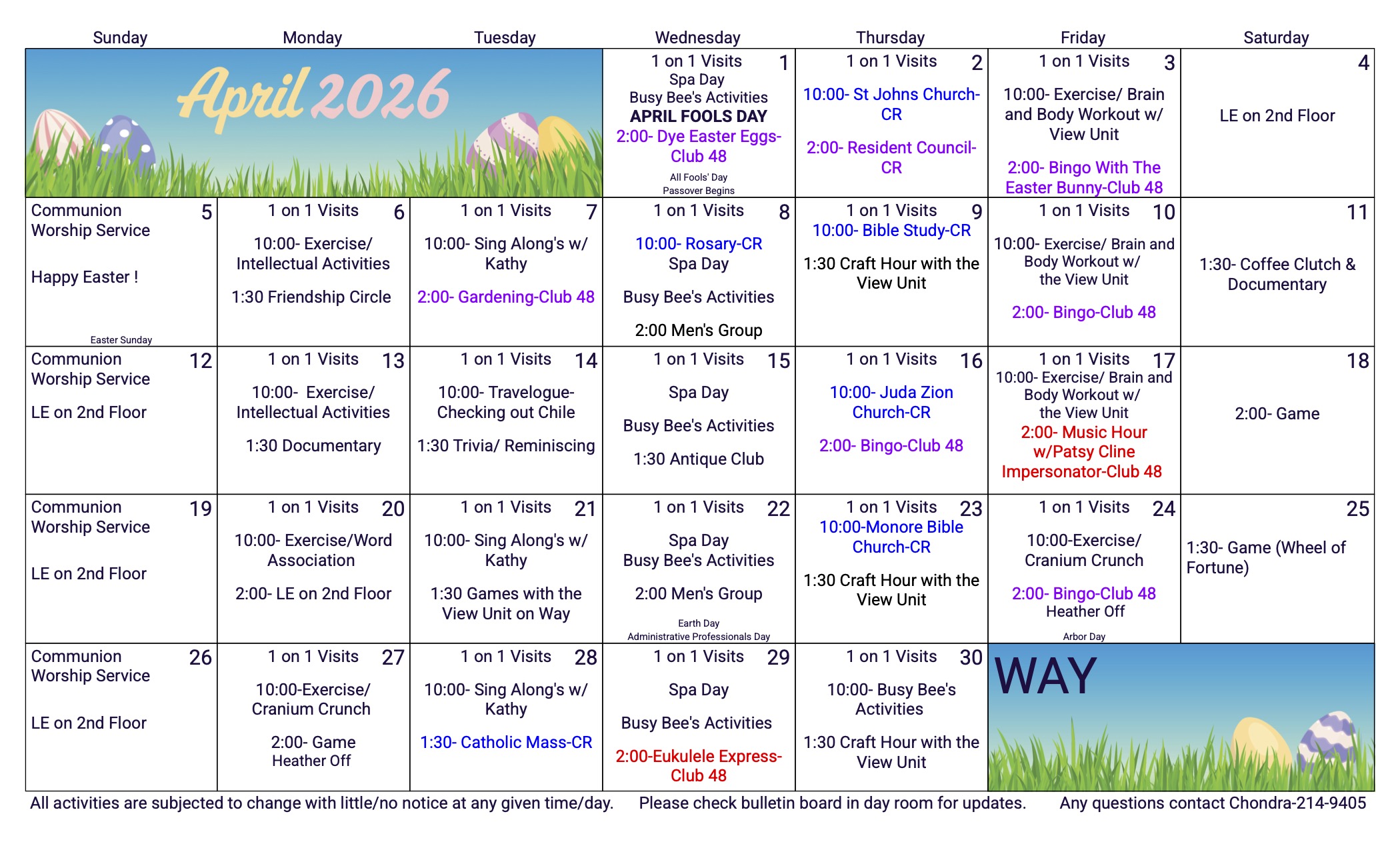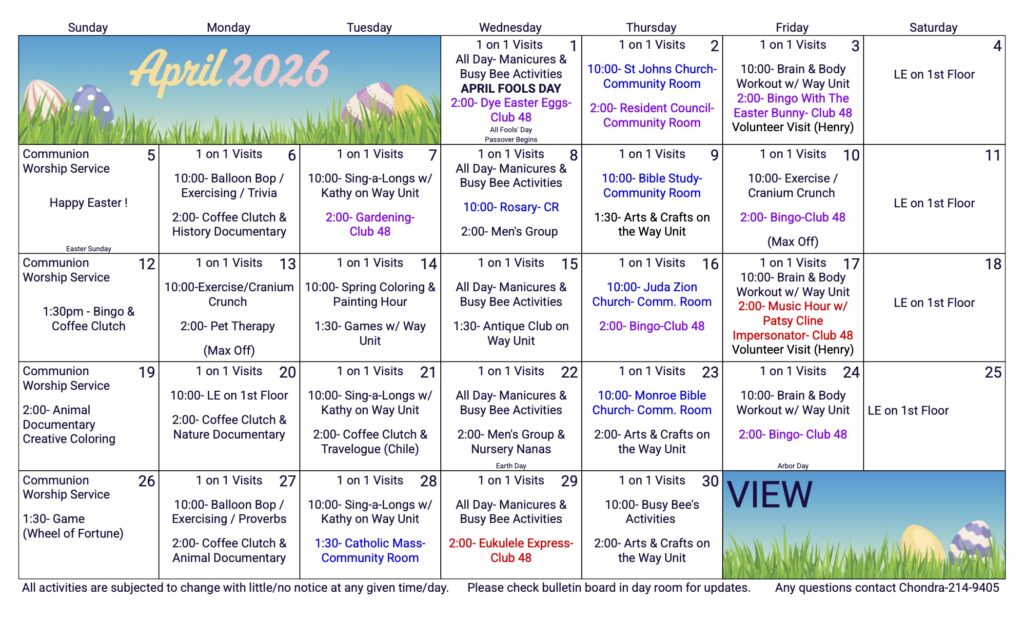 The purpose of our Life Enrichment Department is to provide a program of activities aimed at maintaining the optimum mental, physical, social well being of our residents and to challenge the mind and body to be at its best. We strive to give our residents a meaningful and worthwhile experience in their life while ensuring an atmosphere of respect, dignity and purpose of life.